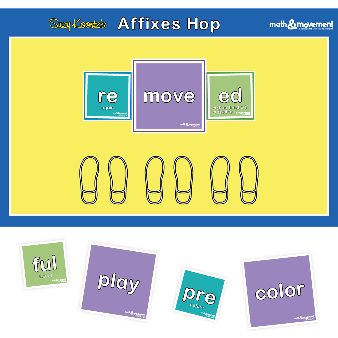 Students will place one of the base word cards (violet) in the center box. They will then add a prefix card (teal) and/or a suffix card (green) to their respective boxes to create a new word. Students say the new word out loud as they jump across the mat. For example: place the “move” base card in the center and use the “re” and “ed” affix cards to form the word “removed.”