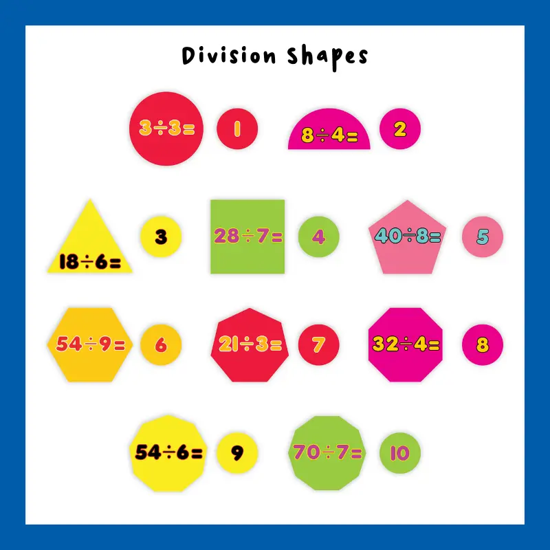 Build strong division and skip-counting skills with these bright, engaging Division Shapes. Each shape is intentionally designed to represent a specific multiple, helping students connect visual, spatial, and numerical thinking.