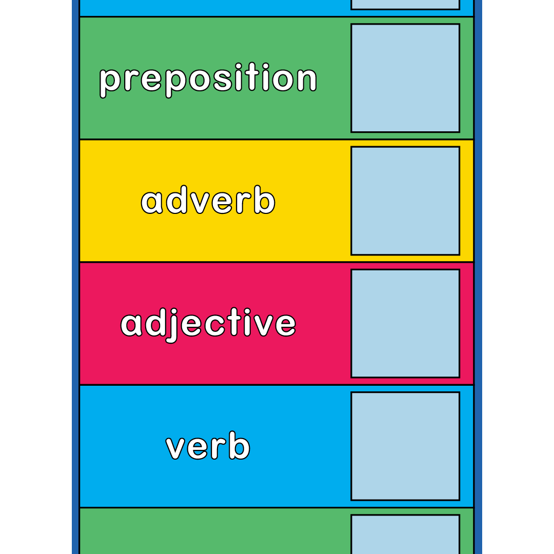 Students will place word cards such as dog, wow, here, and under in the box next to the corresponding part of speech. They will build vocabulary, strengthen their understanding of sentence structures, and deepen their grasp of grammar as they move along the mat.
