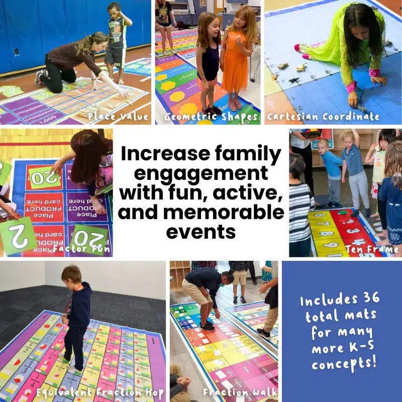 The Jumper Family Fun Night Kit is our most extensive option—designed for schools planning a large-scale family engagement event or looking for a long-term investment in movement-based learning. With 36 colorful floor mats, this kit provides a comprehensive set of materials covering a wide range of math concepts taught from PreK through fifth grade.