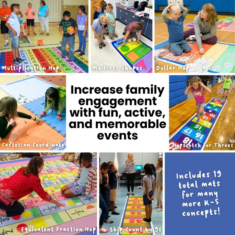 The Skipper Family Fun Night Kit is a great option for schools looking to host a larger family engagement event with expanded opportunities for hands-on learning. This mid-level kit includes 19 colorful floor mats, offering a wider range of math concepts and movement-based activities to keep families actively engaged throughout the event.
