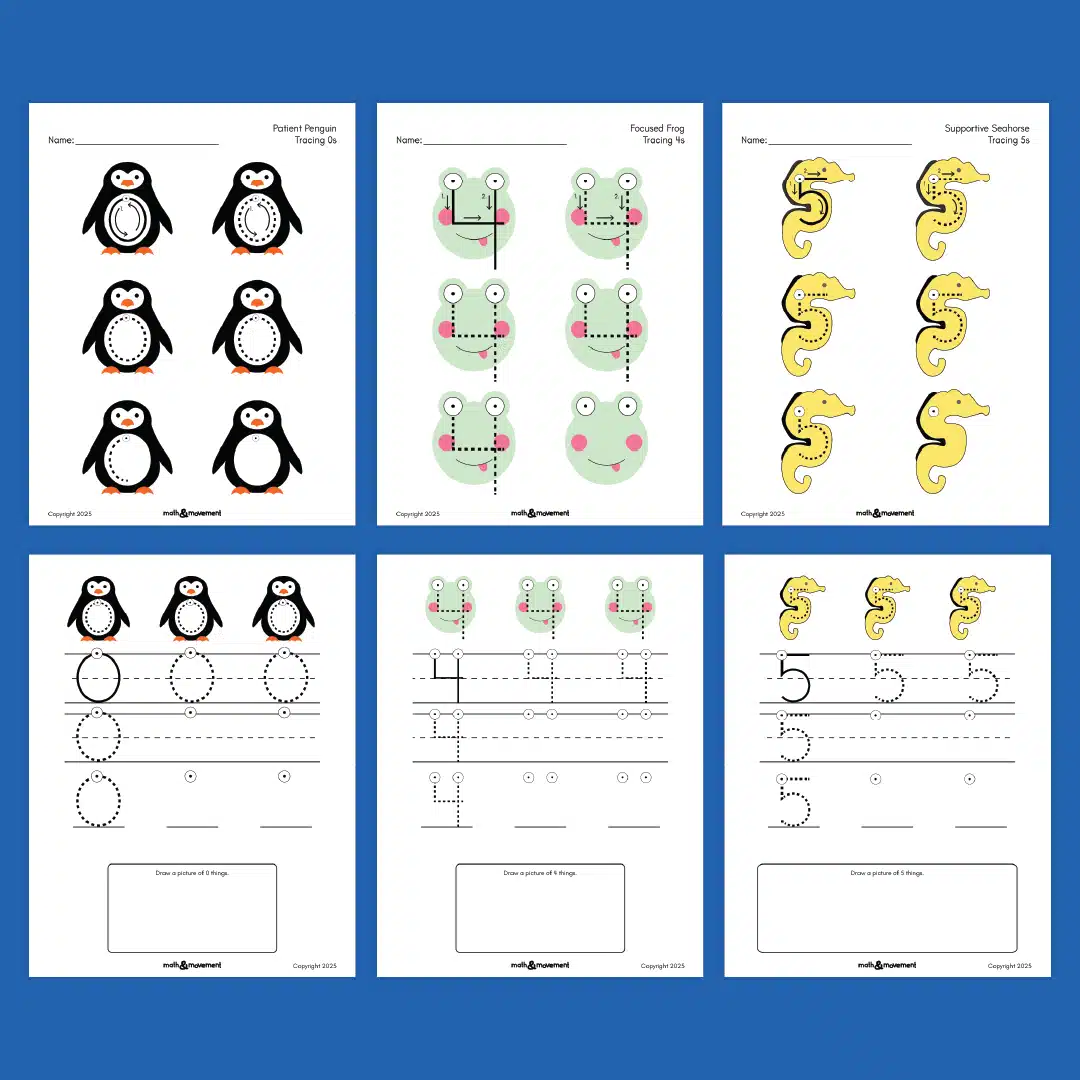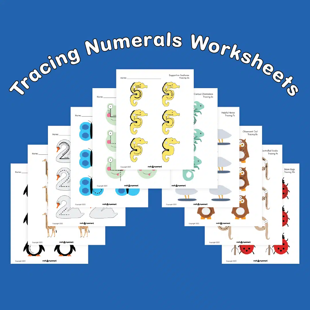 Our Tracing Numerals Worksheets help young students learn numerals 0-10 and their quantities in an interactive way. These worksheets are intended for use alongside our Tracing Numerals Hop floor mat. The adorable animal graphics match the ones on the mat!