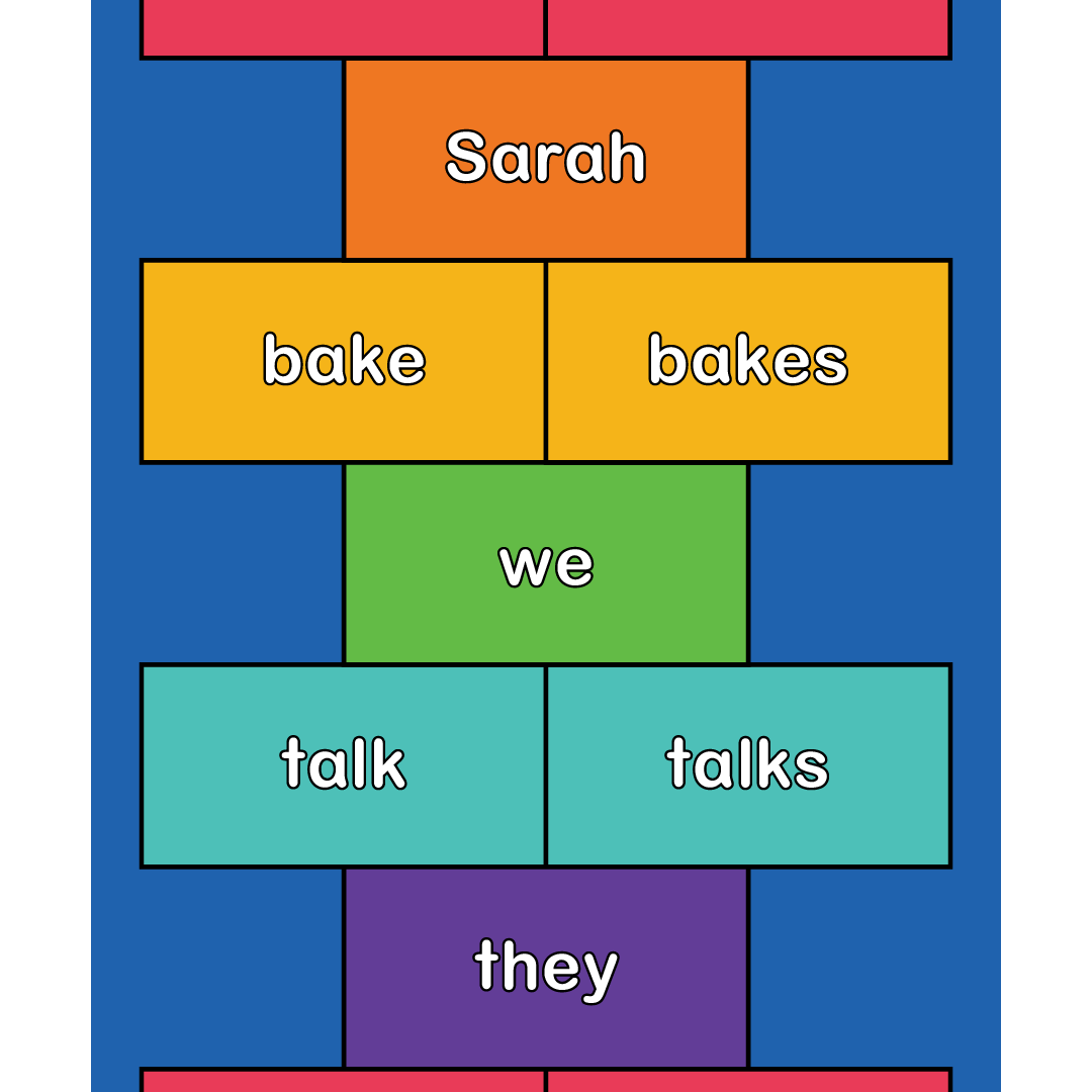 This hopscotch-style floor mat helps students practice matching subjects with the correct verb forms. As students hop, they read a subject and choose the matching verb form (hop/hops, sing/sings, bake/bakes), by jumping to the correct match, reinforcing singular and plural subject verb agreement. The movement-based design supports engagement, oral language practice, and grammar development.